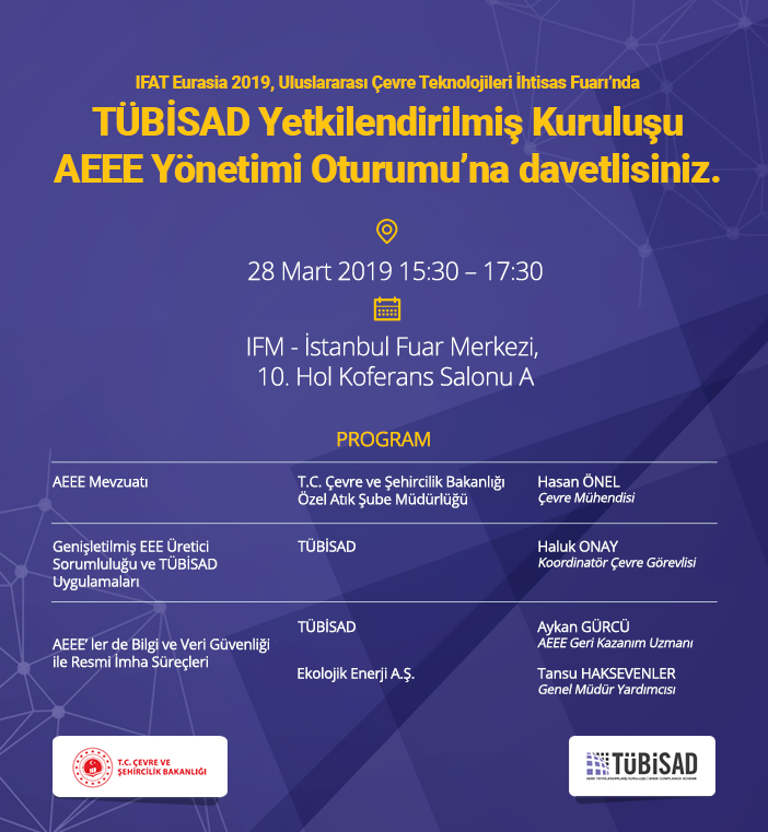 TÜBİSAD tarafından 28.03.2019 tarihinde IFM - İstanbul Fuar Merkezi'nde "AEEE Yönetimi Oturumu" düzenelenecek olup, söz konusu oturuma ilişkin program ilişikte bilgilerinize sunulmuştur.