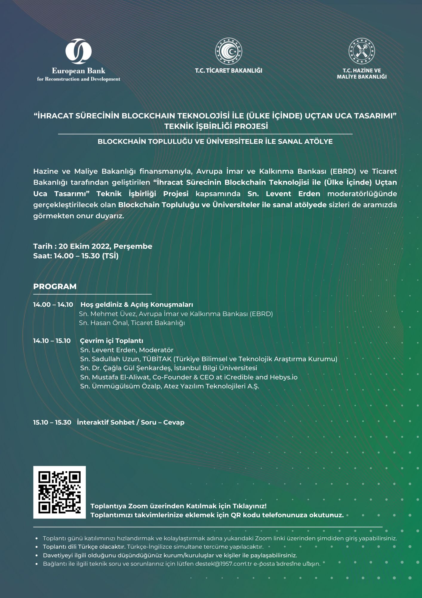 Hazine ve Maliye Bakanlığı finansmanıyla, Avrupa İmar ve Kalkınma Bankası (EBRD) ve Ticaret Bakanlığı tarafından geliştirilen “İhracat Sürecinin Blockchain Teknolojisi ile (Ülke İçinde) Uçtan Uca Tasarımı” Teknik İşbirliği Projesi kapsamında Sn. Levent ERDEN moderatörlüğünde gerçekleştirilecek olan Blockchain Topluluğu ve Üniversiteler ile sanal atölye daveti ilişikte bilgilerinize sunulmuştur.