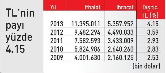 Geçen yıl dolar ve euro karşısında değer kaybeden Türk Lirası, dış ticarette altın yılını yaşadı. Türkiye 2013'te gerçekleştirdiği 403 milyar 519 milyon dolarlık dış ticaretin yüzde 4.15'ini TL cinsinden yaptı. Geçen yıl Türkiye'nin gerçekleştirdiği 251.7 milyar dolarlık ithalatın ise 11 milyar 395 milyon dolarlık kısmı TL cinsinden yapıldı. Bu kalemde 2012'ye göre yüzde 20.2 artış gözlendi. 2006'da ithalatın 1.1 milyarlık kısmı yerel para karşılığında yapılırken, her yıl yaşanan ortalama yüzde 40'lık artışla 11.4 milyar dolara yükseldi.