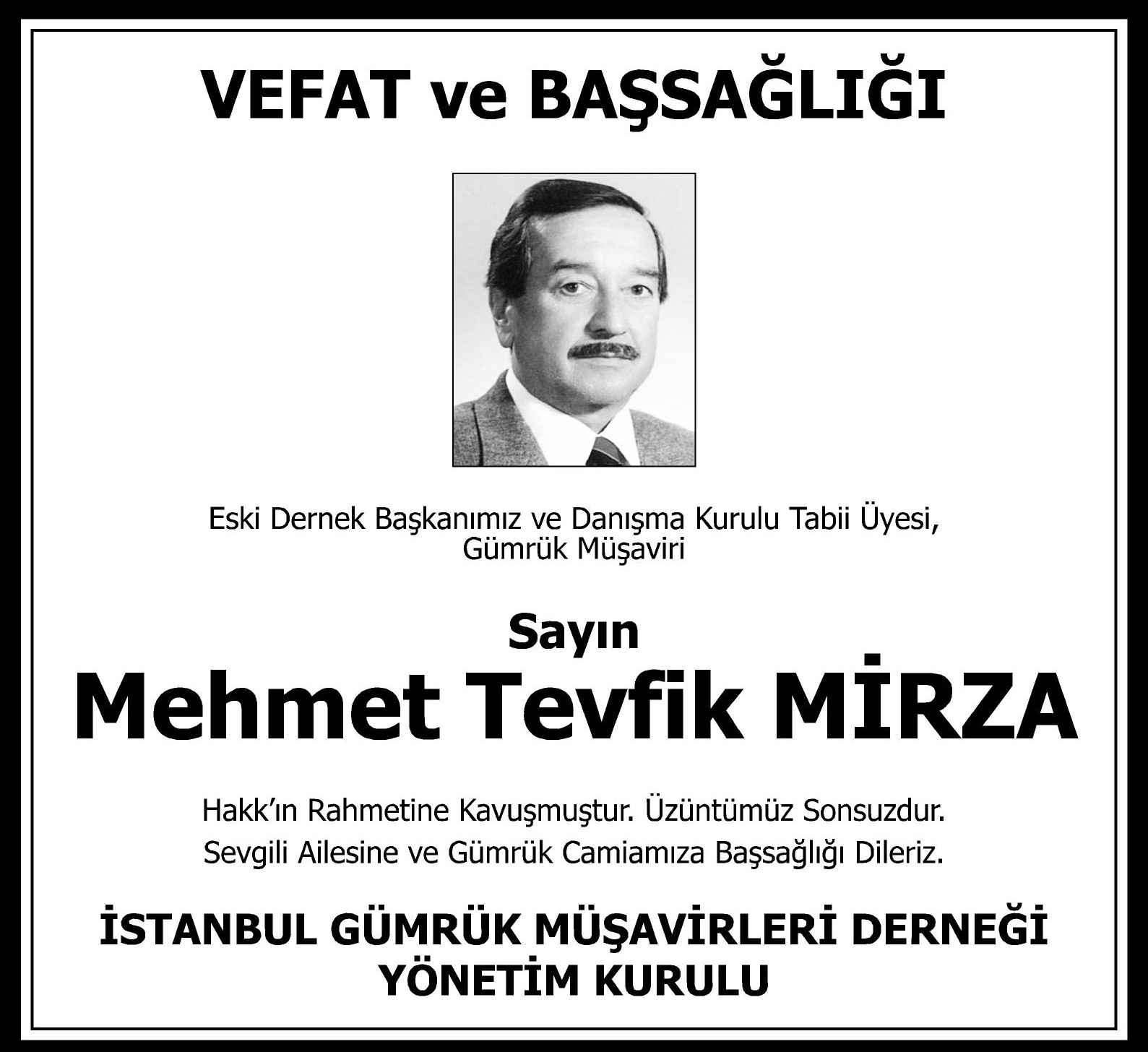 Derneğimizin 1994-1996 yılları arasında Yönetim Kurulu Başkanlığını yapmış GM Sayın Mehmet Tevfik MİRZA’nın Hakk'ın Rahmetine kavuşması nedeniyle üzüntümüz sonsuzdur. Acımızı kamuoyu ile paylaşmak için Sözcü Gazetesine aşağıdaki ilanı vermiş bulunmaktayız.