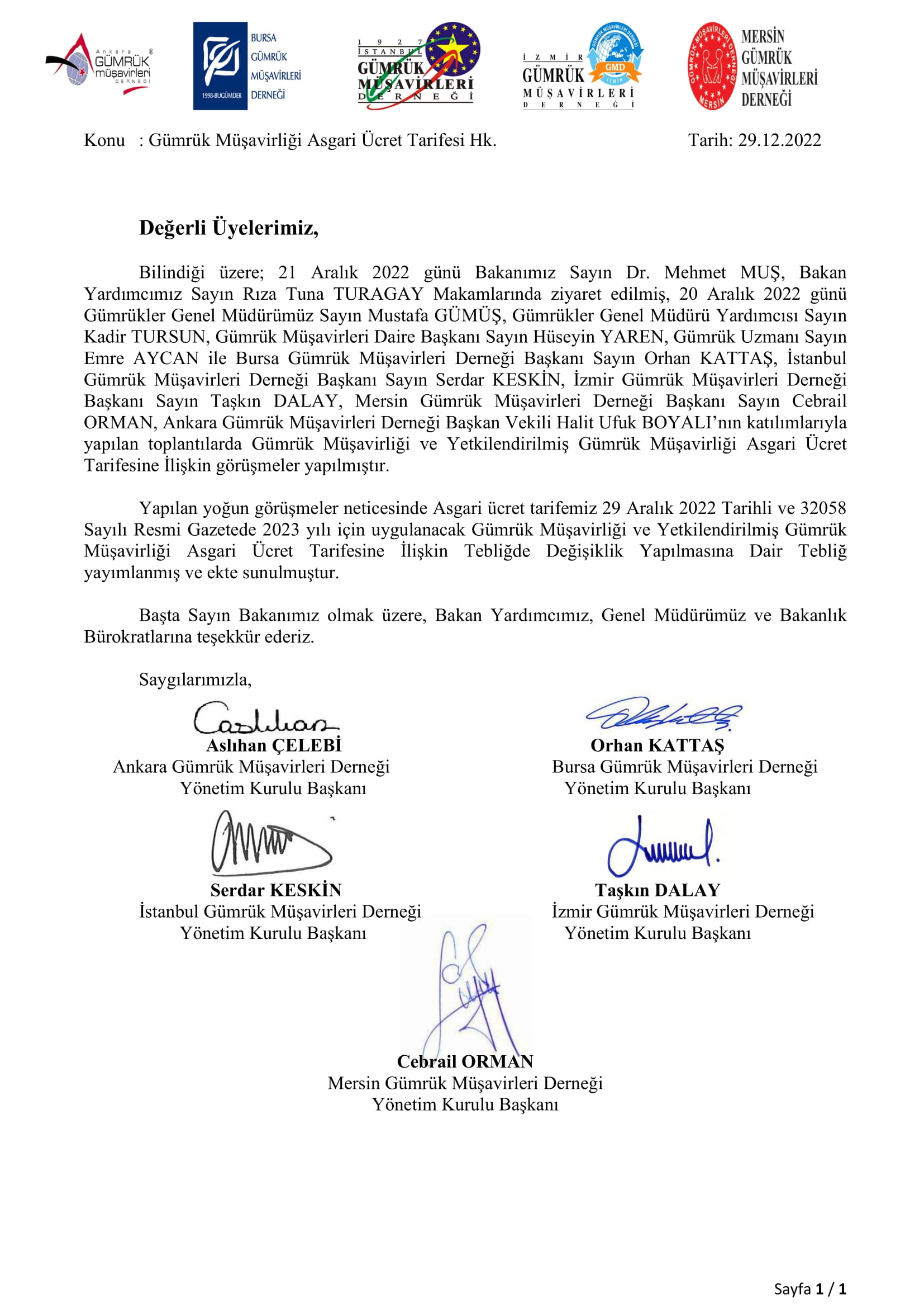 –– Gümrük Müşavirliği ve Yetkilendirilmiş Gümrük Müşavirliği Asgari Ücret Tarifesine İlişkin Tebliğde Değişiklik Yapılmasına Dair Tebliğ