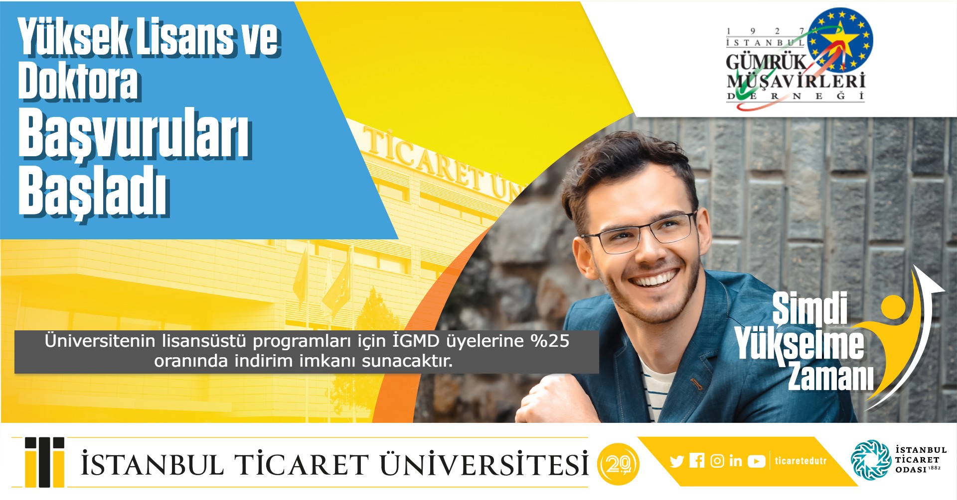Derneğimiz ile İstanbul Ticaret Üniversitesi arasında gerçekleştirilen protokole istinaden lisansüstü programlarında %25 indirim imkanı tanınmış olup, söz konusu programları https://lisansustuaday.ticaret.edu.tr/ sayfasından inceleyebilirsiniz.