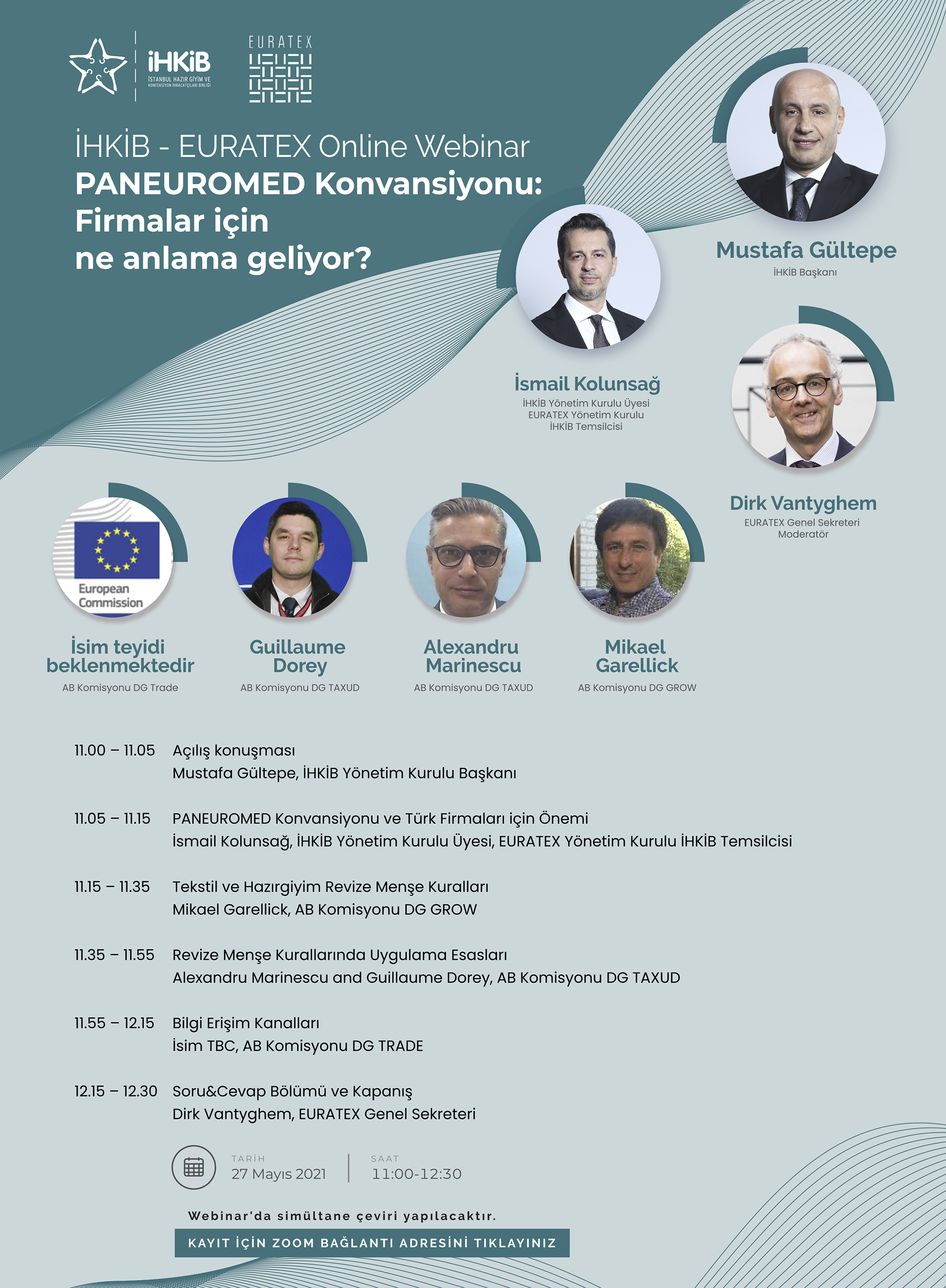 İTKİB Genel Sekreterliği'nin "PEM Bölgesel Konvansiyonu Revizyonu konusunda İHKİB-EURATEX Webinarı" konulu yazısı ilişikte bilgilerinize sunulmuştur.