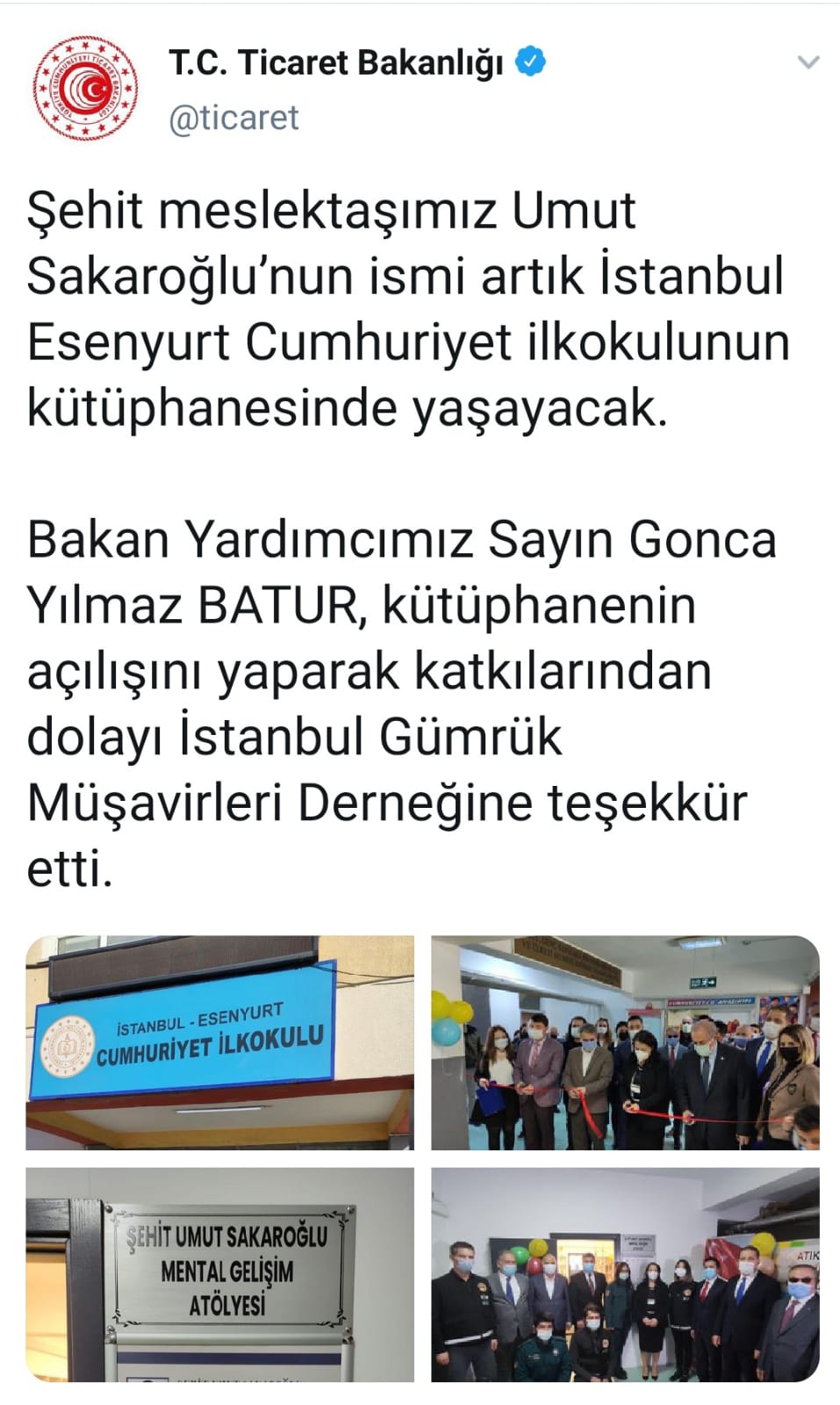 28.06.2016 tarihinde İstanbul Atatürk Havalimanı’ndaki terör saldırısında şehit olan Gümrük Muhafaza Memuru Umut SAKAROĞLU’nun aziz hatırasını yaşamak için kurulan Mental Gelişim Atölyesi ve Kütüphanesi açılış törenine; Ticaret Bakan Yardımcısı Sayın Gonca YILMAZ BATUR, Esenyurt Kaymakamı Sayın Dr. Vural KARAGÜL, İlçe Milli Eğitim Müdürü Sayın Paşali BEŞLİ, Muhafaza Genel Müdür Yardımcısı Sayın Mehmet AKILLI, İstanbul Gümrük ve Dış Ticaret Bölge Müdürü Sayın Yalçın ÖZDEN, Gürbulak Gümrük ve Dış Ticaret Bölge Müdürü Sayın Kadri KARAKUŞ, İstanbul Gümrük Müşavirleri Derneği Yönetim Kurulu Başkanımız Sayın Serdar KESKİN, Okul Müdürü Sayın Serkan GÖKŞEN, İstanbul Gümrük Müşavirleri Derneği Yönetim Kurulu Başkan Vekillerimiz Sayın Rıdvan HALİLOĞLU, Sayın Nizamettin AĞAR, Yönetim Kurulu Üyelerimiz Sayın Atakan ÖRNAL, Sayın Mustafa AKBAĞ, Sayın Hasan Hüseyin ERCAN, İGMD Kadın Komitemizin Başkanı Sayın Melek DALKIN, Komite Üyelerimiz Sayın Aslı ALKAN, Sayın Aygül BAYRAKTAR, Sayın Nurcan YENİAY, Sayın Tuğba GENÇ ve Gümrük Müdürlerimiz katıldı.